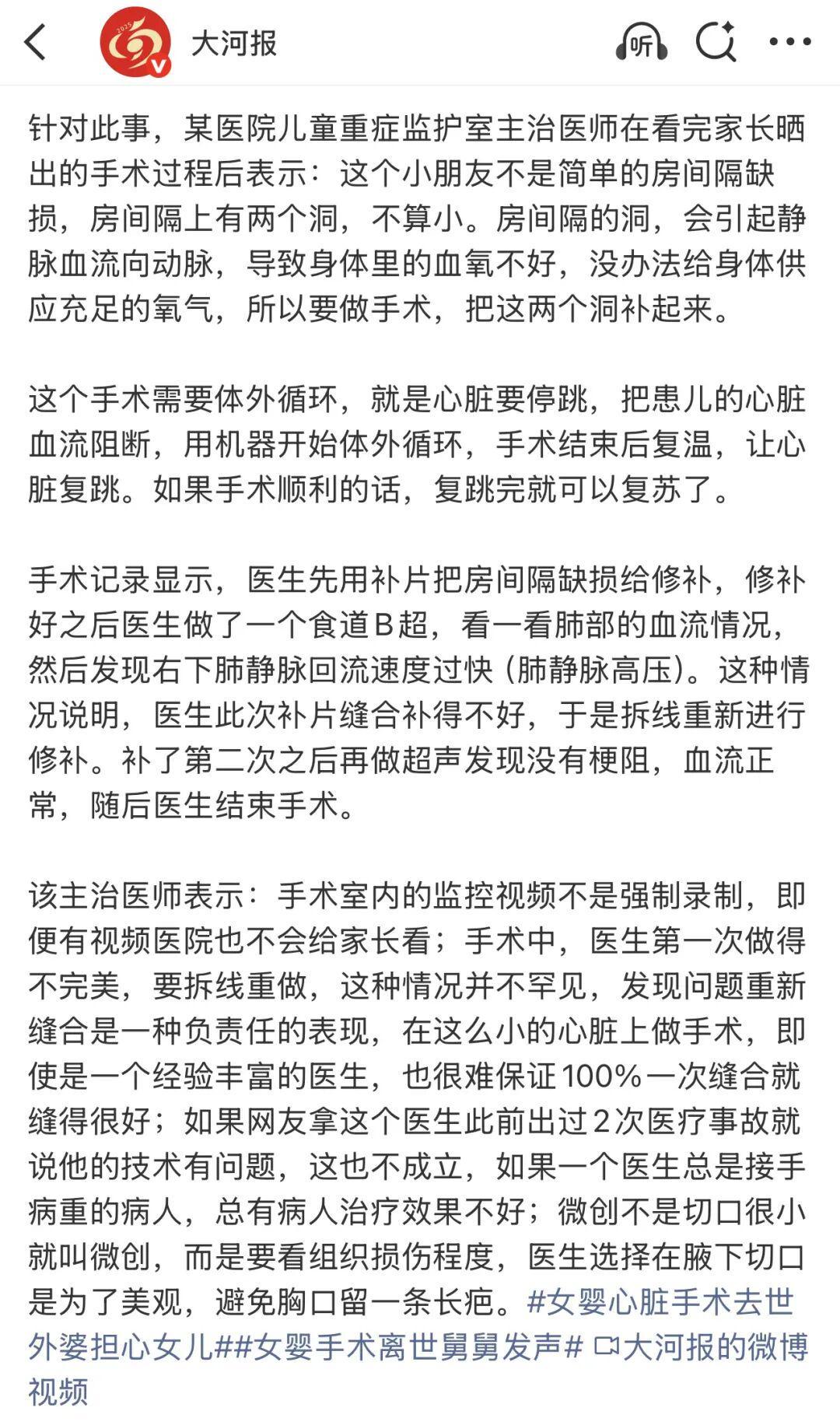 针对此事故,某医院儿童重症监护室主治医师在看完家长晒出的手术过程后表示:这个小朋友不是简单的房间隔缺损,房间隔上有两个洞,不算小。房间隔的洞,会引起静脉血流向动脉,导致身体里的血氧不好,没办法给身体供应充足的氧气,所以要做手术,把这两个洞补起来。
