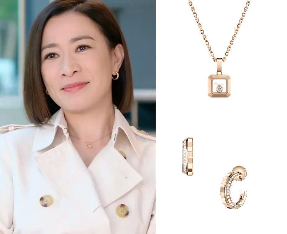 比如这组穿戴次数最多的萧邦Ice Cube系列小方糖吊坠+冰块耳环,象征着她理性,不带感情色彩的判断力。项链的几何方形镂空与内部的钻石点缀,很有萧邦特色,耳环也是开口设计,金镶钻经典简约。