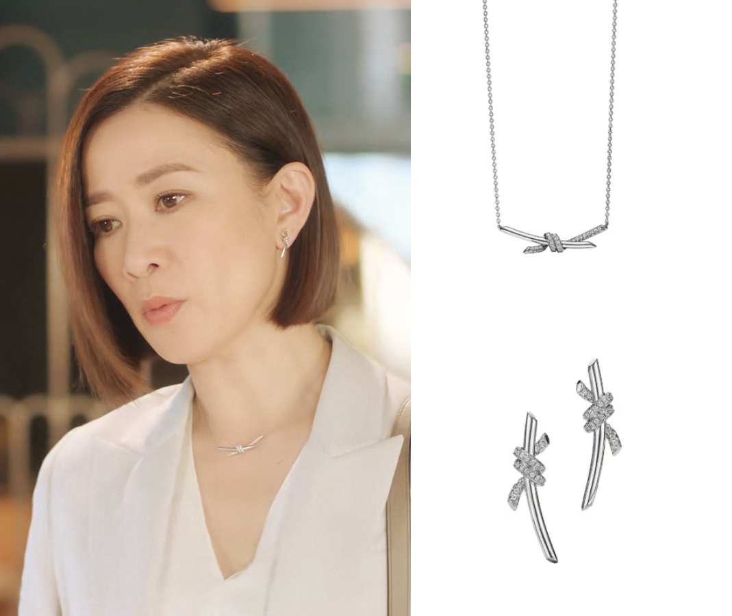 TiffanyKnot系列更是点睛一笔。她选择的是18K白金项链与耳钉,造型足够日常和低调,又有着刚柔并济的风格。而本身的“绳结”寓意,也象征着她在职场里与人的微妙关系,简直像是为她量身定制的。