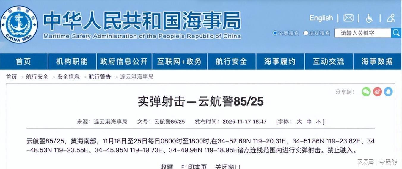面对日美联动施压,中国采取多维度反制措施。外交层面,中国驻日使馆紧急召见日本外务省官员,重申钓鱼岛主权归属;海警部门通过官方渠道宣布将持续开展常态化巡航。军事方面,海事部门宣布11月18日至25日在黄海南部举行实弹演习,海军“鞍山”舰编队穿越大隅海峡进入西太平洋,展示远海作战能力。这些组合拳既彰显维护主权的坚定决心,又形成有效战略威慑。