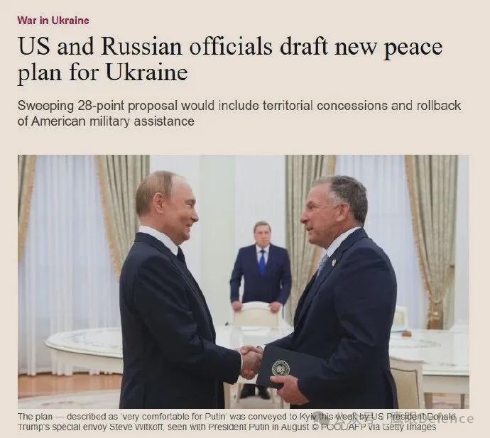 据媒体报道,特朗普政府对其“和平计划”充满信心,甚至认为泽连斯基因战场压力与国内危机(如近期曝光的能源部门贪腐丑闻)将被迫接受这一方案。匿名美国官员向Axios透露:“若战争持续,乌克兰终将失去领土,因此现在达成协议符合基辅利益。球在泽连斯基脚下,我们正在等待回应。”路透社则援引消息称,特朗普将向泽连斯基施压,要求其接受协议,而评论普遍认为该“28点和平框架”等同于向俄罗斯投降,仅满足了克里姆林宫的最大化诉求。