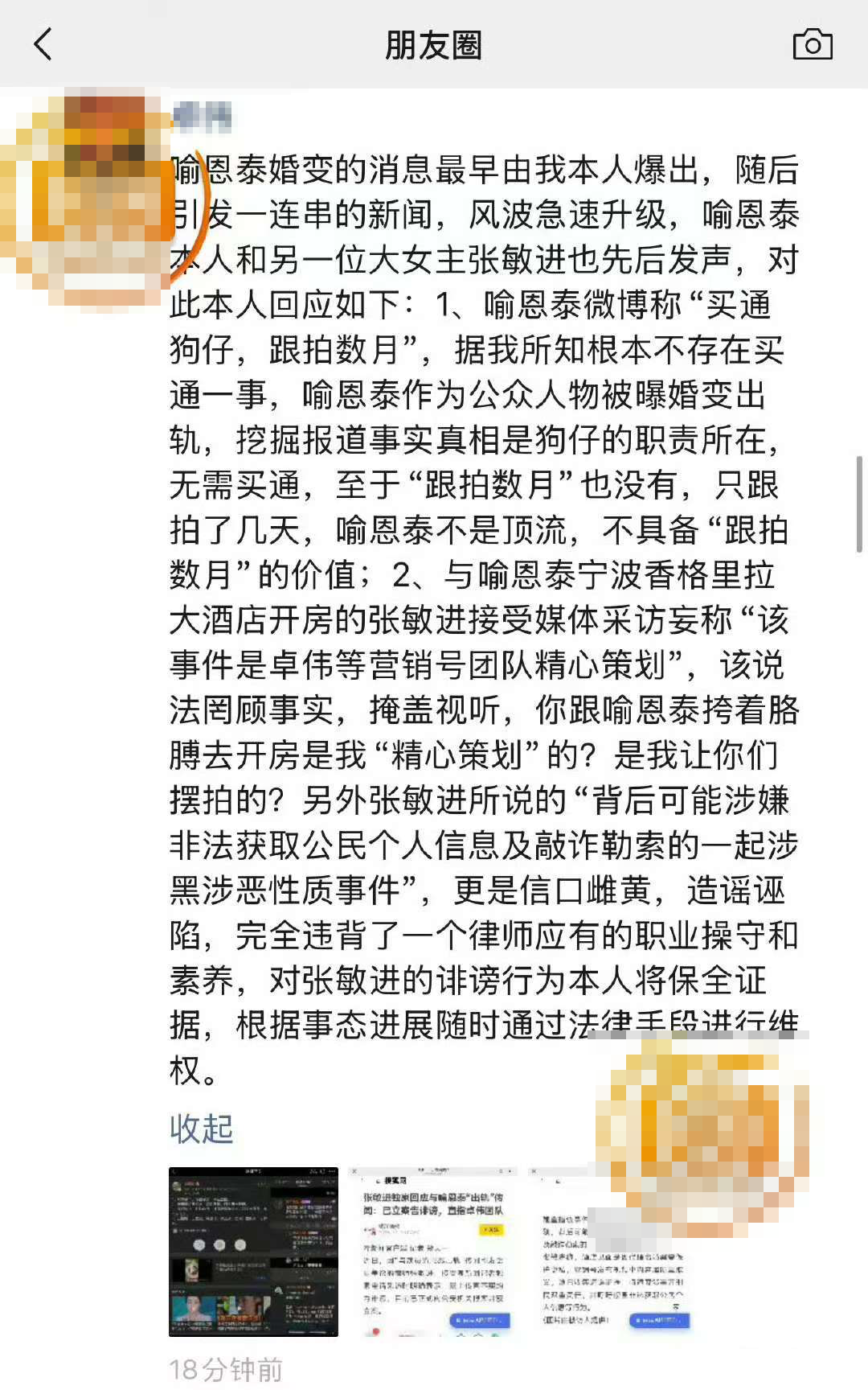 他在朋友圈发表了一段文字,否认了喻恩泰所说“跟拍数月”的事实,并直指他跟女律师的关系并非自己杜撰。