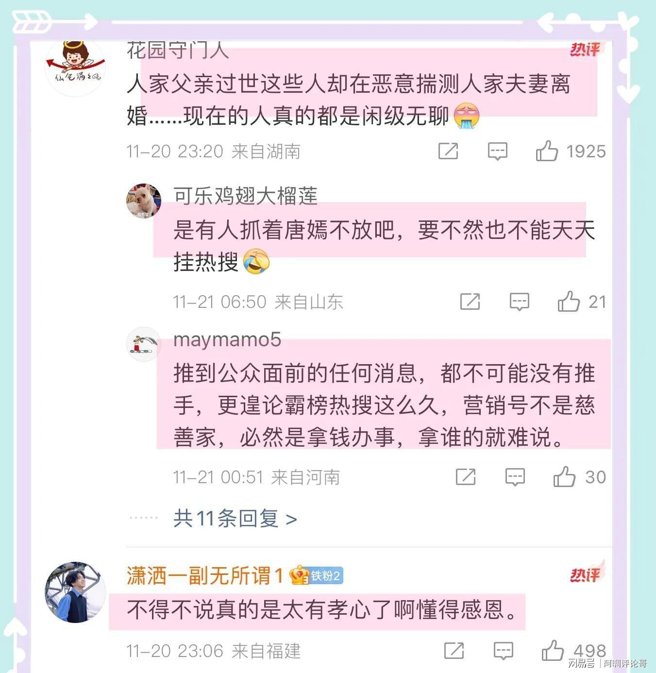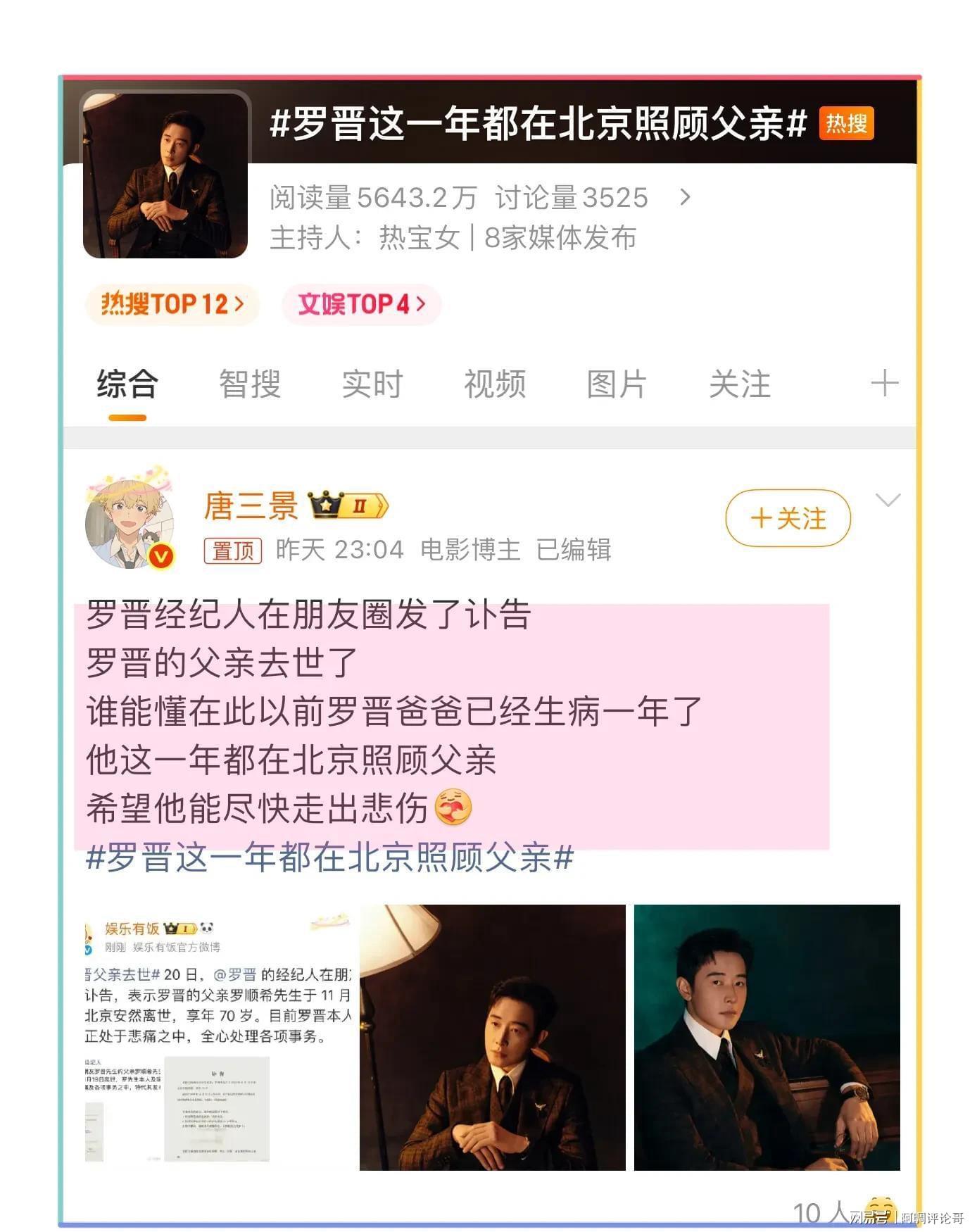 昨晚,罗晋的经纪人代替罗晋发布了讣告,网友们这才得知,19号罗晋70岁的父亲不幸离世。而巧合的是,网友们列出唐嫣罗晋离婚时间线也正是在19号。很多网友突然明白,为什么这两天传离婚这么久,两人都不回应,原来是因为有比这更重要的事情——照顾罗晋的父亲。谣言无需理会,而经纪人代替罗晋发布讣告,一方面是因为罗晋正处于伤心难过的状态,另一方面作为独生子,他要扛起大梁忙父亲的后事。同时,也是想告诉吃瓜网友,差不多得了,人家都这么伤心了,别再添乱了。