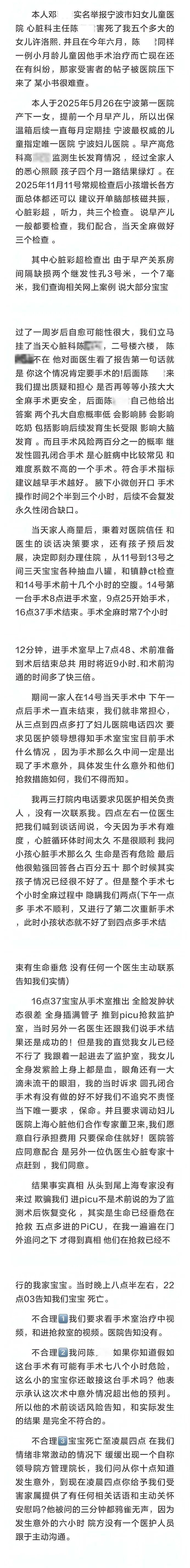 邓女士称,2025年11月女儿在【宁波大学附属妇女儿童医院】体检时发现房间隔缺损(两个继发性孔:3mm和7mm)。家属称查询资料后认为此类缺损有自愈可能,但接诊医生陈某贤(小儿心胸外科主任)坚持手术,表示否则会影响孩子生长发育,并称手术风险仅“1/200”且为“常见简单微创手术”。