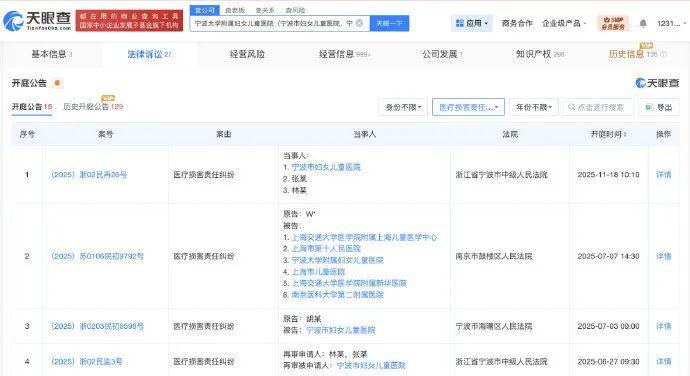 此外,根据公开资料查到,【宁波大学附属妇女儿童医院】涉诉信息中,超90%的案件身份为被告,案由统计显示“医疗损害责任纠纷”占比最高。