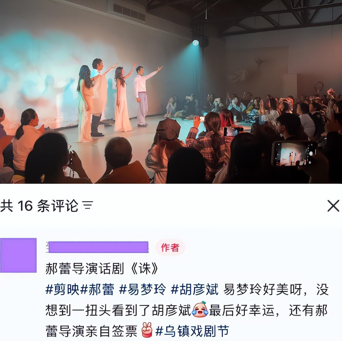只不过他们的关系进展还挺快,一个月后胡彦斌就带着他母亲去乌镇戏剧节,为易梦玲主演的话剧《诛》捧场。