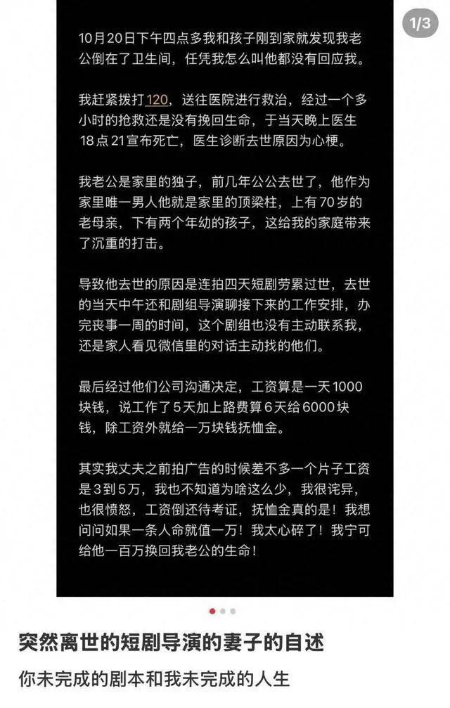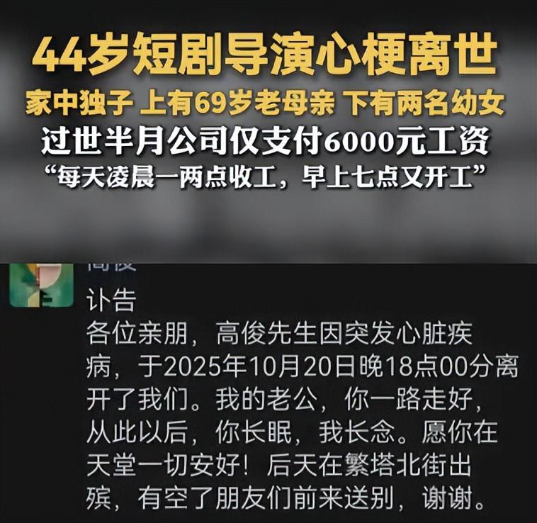5.《大众日报视频号》44岁短剧导演心梗离世,家中独子,上有69岁老母亲,下有两名幼女。过世半月公司仅支付6000元工资“每天凌晨一两点收工,早上七点又开工” 心梗