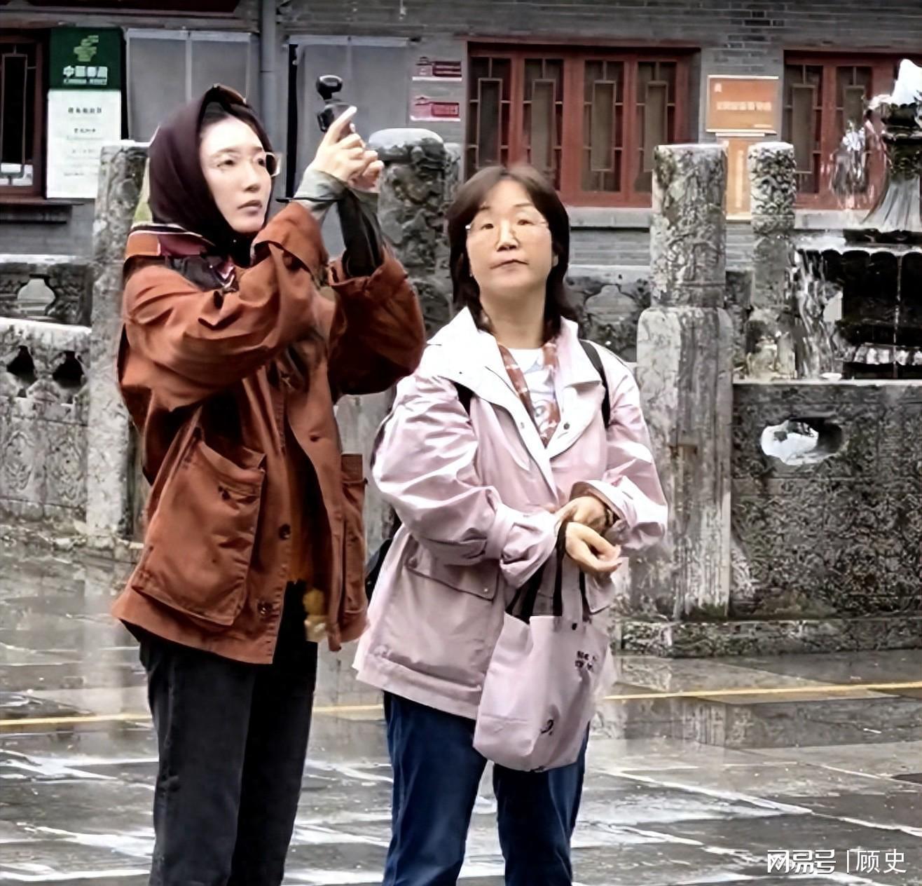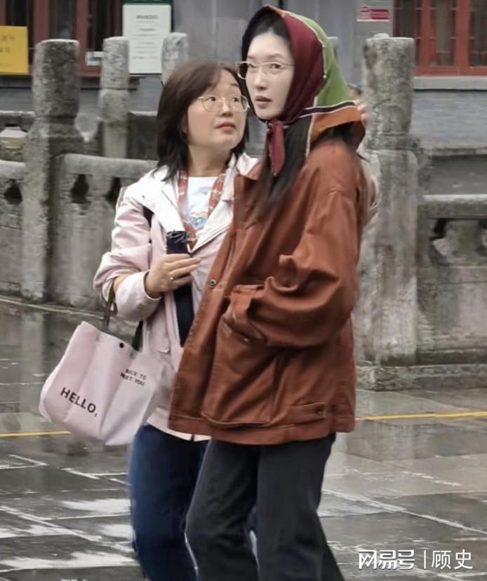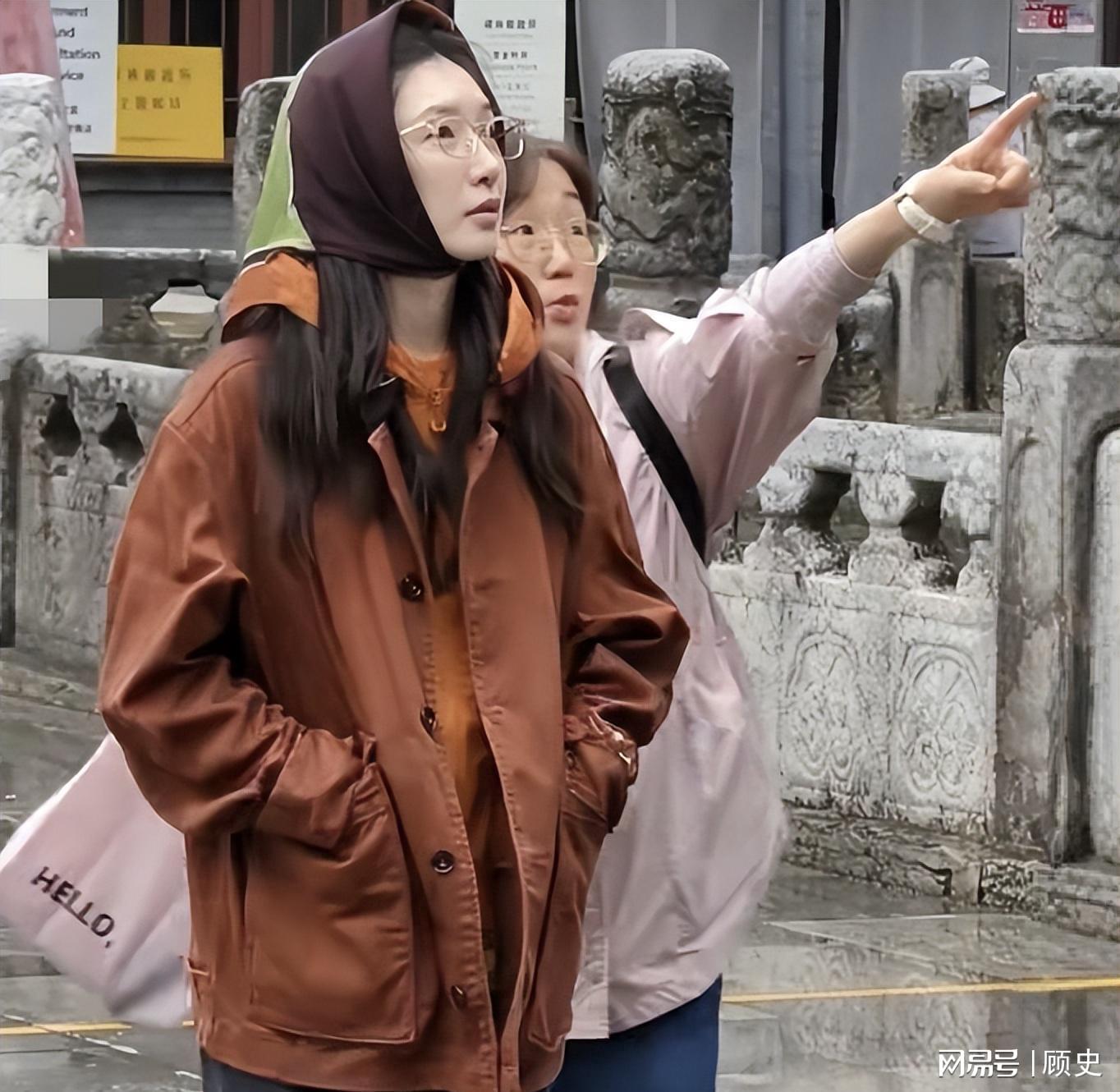 她戴着眼镜,头巾随意地扎在头上,身穿一件棕色的连帽外套,搭配深灰色的长裤和一双白色的平底鞋。这一身装扮,在雨天的西安碑林里,显得格外普通,几乎让人难以认出这位明星。