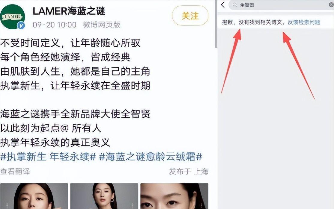 海蓝之谜的动作则更彻底。争议曝光后1小时,海蓝之谜官方微博就删除了所有与全智贤相关的内容,包括3条宣传视频、12组活动照片和8条产品推广博文。而且小红书账号也同步清空了涉及她的15篇笔记,甚至连2023年品牌会员日活动中“全智贤同款”的描述都一并删除。不仅如此,有网友发现海蓝之谜海外官网的全智贤物料也被移除,不同于部分品牌“只在中国市场做样子”,海蓝之谜的“全球同步清退”,被解读为“真正重视中国消费者的情感”。