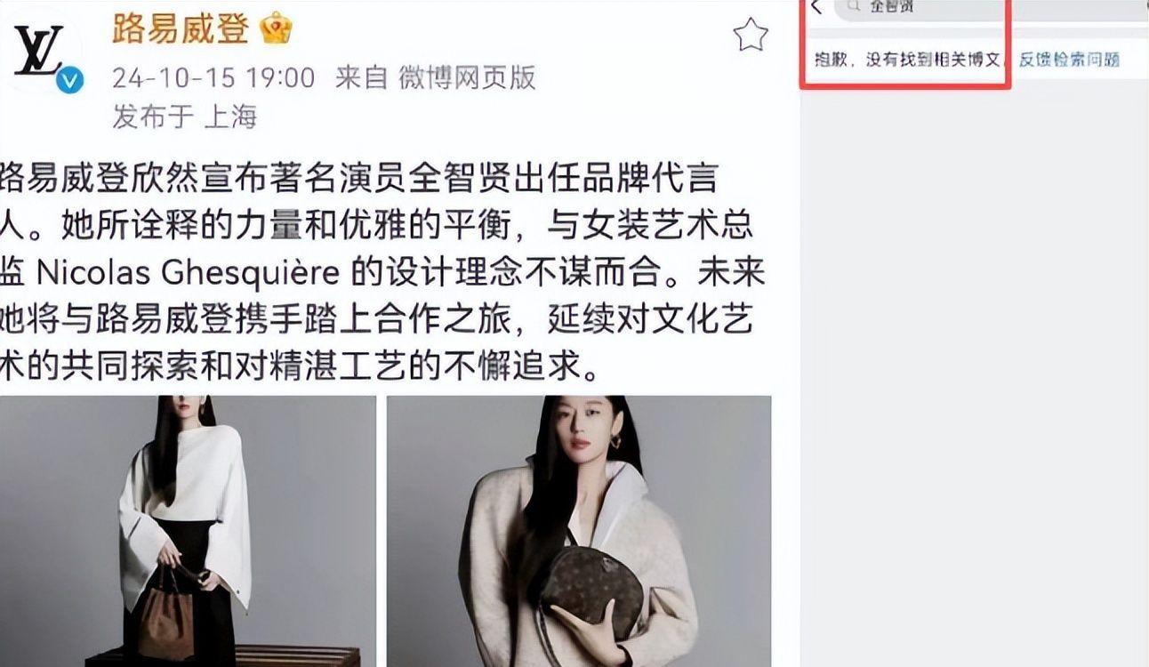 而与之形成鲜明对比的,是LV的迟缓与双标。争议发酵的前12小时里,LV中国官方微博上,全智贤拍摄的春夏系列宣传海报仍挂在首页banner位,品牌2025年早春秀的现场照片中,她的单人照也依旧置顶。网友在评论区留言“请撤下辱华艺人”,却未得到任何回应,甚至有消费者私信LV客服,得到的却是“打太极”式回复,根本没想解决问题。直到争议爆发20小时后,LV才悄悄删除了中国官微的全智贤内容,但海外社交账号的操作却截然不同。