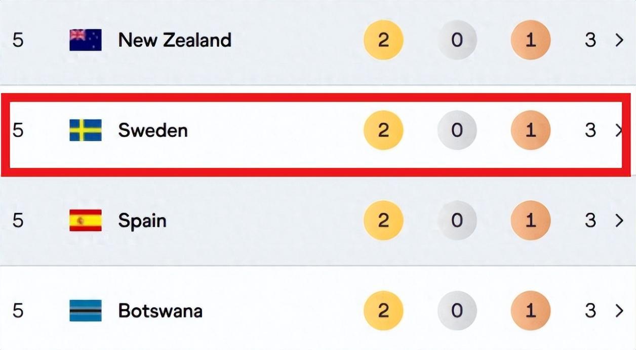 就这一枚金牌,让瑞典的排名直接从前一日的第13名,升到了并列第5名。