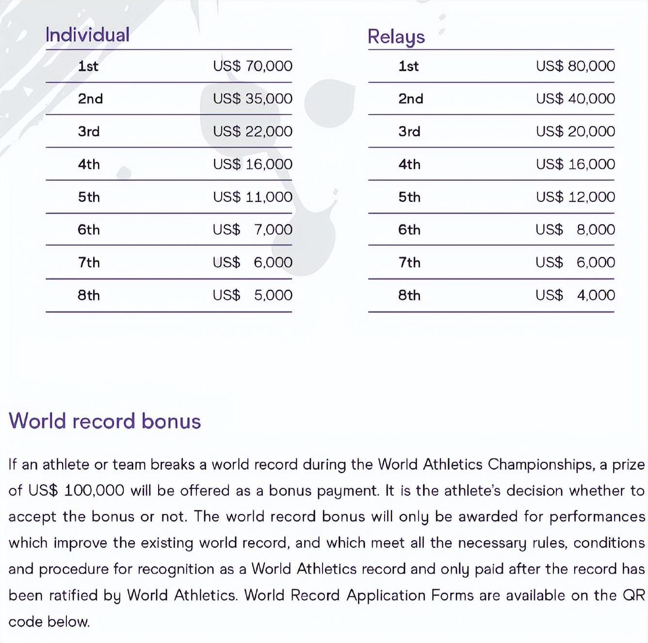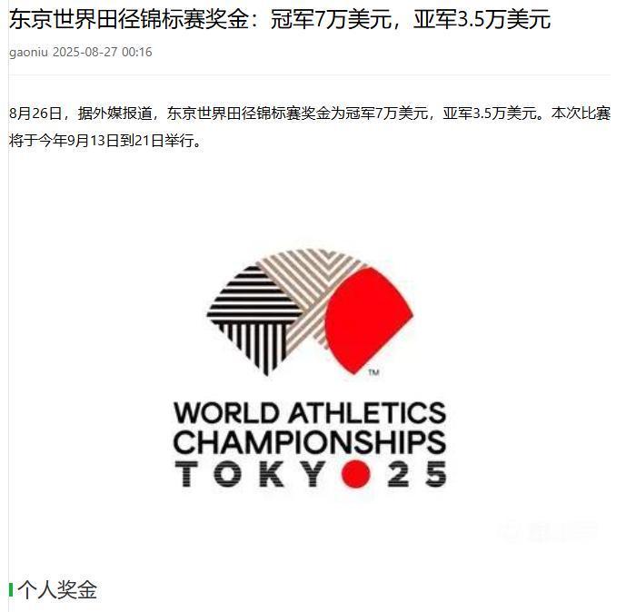信源来自:懂球帝 2025-8-27 东京世界田径锦标赛奖金:冠军7万美元,亚军3.5万美元