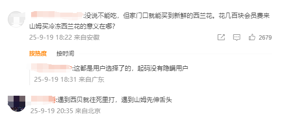 网友在山姆货架发现的“冷冻西兰花”引发新一轮争议,但与西贝遭遇的口诛笔伐不同,山姆会员店的评论区呈现出微妙平衡。