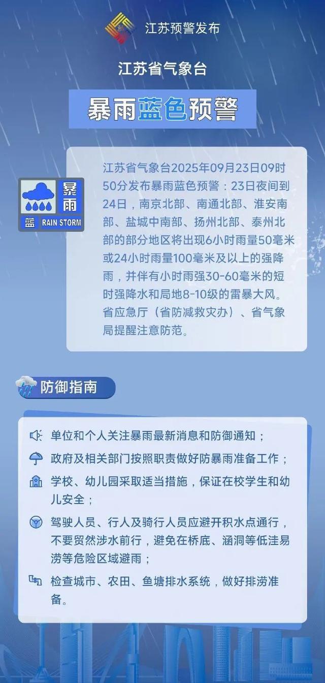 江苏省气象台于9月23日9时50分正式发布了暴雨蓝色预警,提醒广大市民注意防范即将到来的强降雨天气。