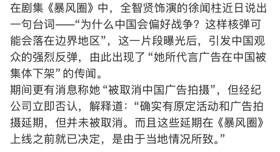 9月23日,韩国媒体针对全智贤在中国引起的风波进行了持续报道,并终于采访到了全智贤方。针对中国方面的广告业务被撤下的传闻,全智贤方做出回应,称网传中国广告业务被取消为不实内容。他们解释道,确实有原定广告拍摄被延期,但并未取消,且这些延期是在《暴风圈》上线之前就已经决定好的,是由当地情况所致。