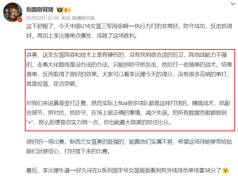 媒体人别跑刚被猪在评价这场比赛时指出,这支女篮在阵容和技术上都有硬伤,没有合适的后卫,阵地战能力也不强,走高大化路线是没有办法的办法。然而,李沅珊的出现却在一定程度上掩盖了这些硬伤。她的得分方式并不花哨,就是简单的投篮和定点突破,实际上很多FIBA球队都是这样打球,精简战术抓配合细节,拼对抗抓防守减少失误,把数据贡献都做到极致,即使硬实力弱一点也能最大限度咬住比分。