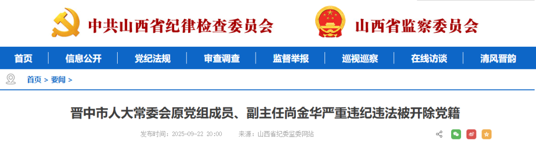 近日,山西省纪委监委发布通报,经省委批准,对晋中市人大常委会原党组成员、副主任尚金华的严重违纪违法问题进行了立案审查调查,并依法作出了严肃处理。