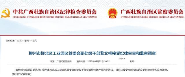 据柳州市纪委监委消息,柳州市柳北区工业园区管委会副处级干部黎文柳涉嫌严重违纪违法,目前正接受柳州市纪委监委的纪律审查和监察调查。