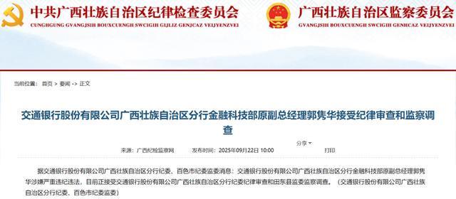 据交通银行股份有限公司广西壮族自治区分行纪委、百色市纪委监委消息,交通银行股份有限公司广西壮族自治区分行金融科技部原副总经理郭隽华涉嫌严重违纪违法,目前正接受交通银行股份有限公司广西壮族自治区分行纪委的纪律审查和田东县监委的监察调查。