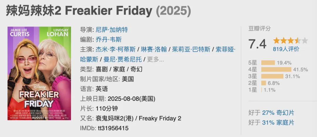 续作《辣妈辣妹2》在延续经典设定的基础上,将灵魂互换人数从两人扩展至四人。杰米·李·柯蒂斯与琳赛·洛翰的再度合作,加上查德·迈克尔·墨瑞与马克·哈蒙等原班人马的回归,构成影片最大的情怀卖点。这种老友重聚的叙事策略,精准击中了初代观众的情感记忆点。