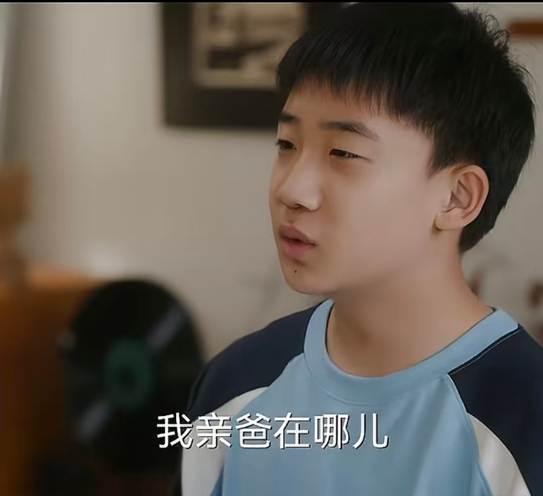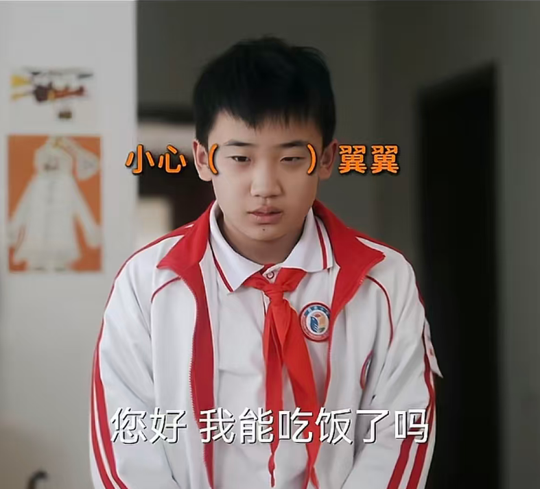这段切片剧情是一家四口的早餐,大儿子刘果宁怯生生站在桌前问爸爸:您好,我能吃饭了吗?