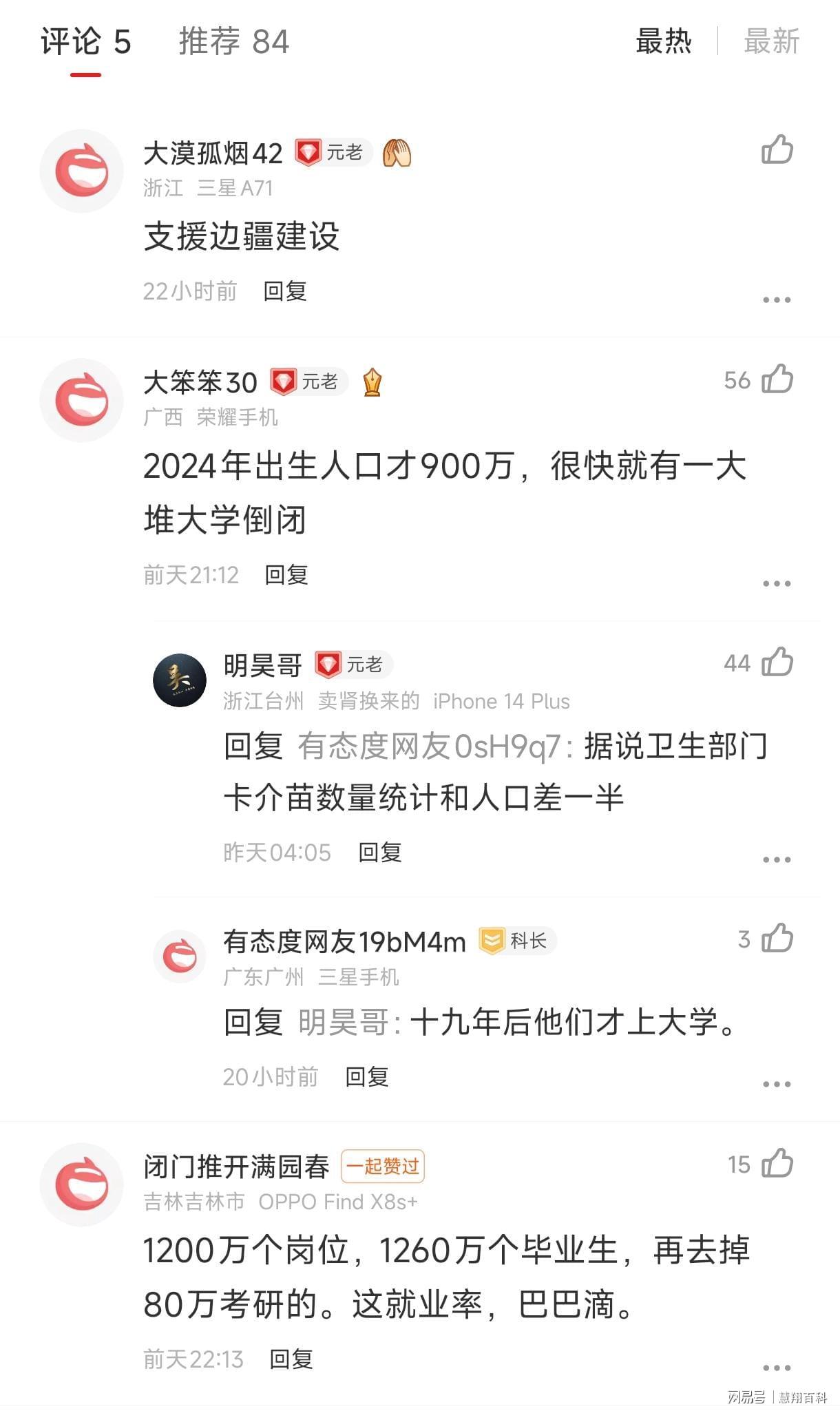 数据对比引发网络热议:有吉林网友计算发现,1200万岗位对应1270万毕业生,若扣除约80万继续深造人群,理论就业率可达94%。但广西网友提出的另一个维度更令人深思——2024年全国新出生人口仅900万人,这个数字仅相当于2026届毕业生的71%。