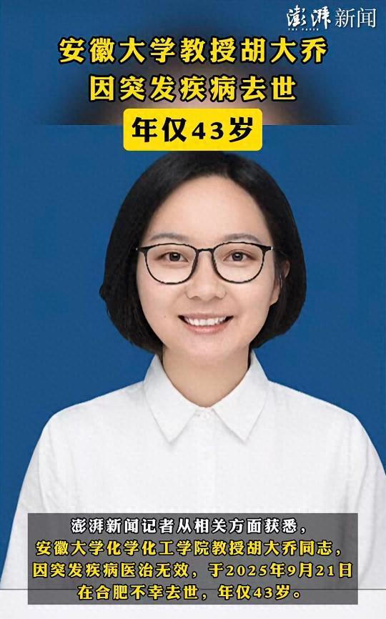 9月22日,多家官方媒体证实了一则令人痛心的消息:安徽大学化学化工学院的胡大乔教授不幸离世,年仅43岁。据讣告透露,胡大乔教授是因突发疾病去世,走得十分突然,令人扼腕叹息。