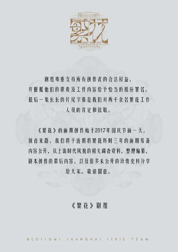 针对此事,9月20日下午,《繁花》剧组回应称:“剧组始终支持所有创作者的合法权益,并根据每个人的职责和工作内容给予相应的署名。最后一集长长的片尾字幕,是对两千余名工作人员的肯定和致敬。”剧组还表示,将公开历时三年的前期筹备及幕后内容,以正视听。