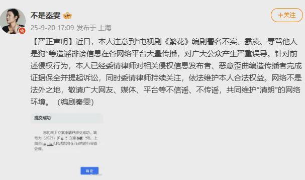 9月20日,《繁花》编剧秦雯也发表声明回应此事。她表示注意到“《繁花》编剧署名不实、霸凌、辱骂他人是狗”等造谣诽谤信息在各网络平台大量传播,对广大公众产生了严重误导。她已委请律师对相关侵权信息发布者完成证据保全,并提起了诉讼。