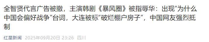 红星新闻|全智贤代言广告被撤,主演韩剧《暴风圈》被指辱华:出现“为什么中国会偏好战争”台词,大连被标“破烂棚户房子”,中国网友强烈抵制.2025