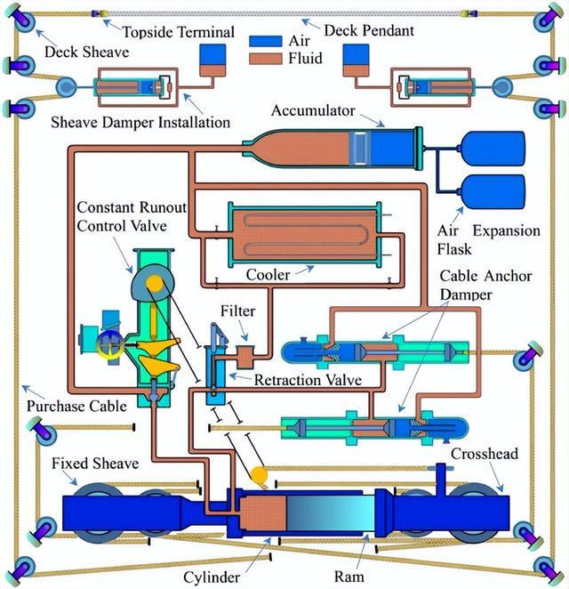 最常见的着陆方式就是拦阻钩挂住拦阻索,战斗机速度迅速降至零,这个过程的原理有两种,之前用液压式,拦阻索会拉动一个液压油缸,将液压油通过一个小孔注入另一个油缸,这个过程就将液压阻尼减速,代价就是经过多次拦阻后液压油会不断升温。