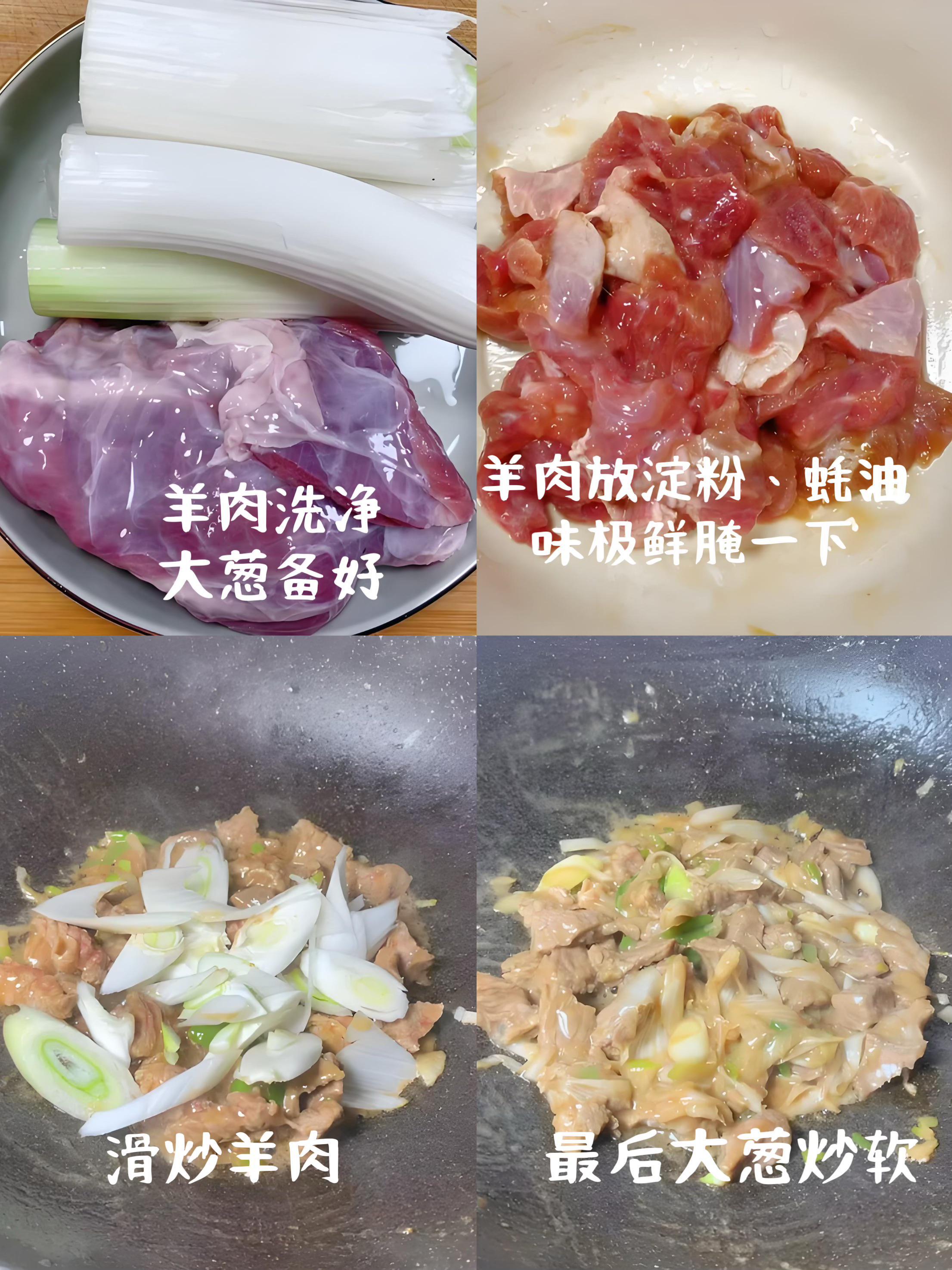 1. 羊肉(最好用羊后腿肉)逆着纹理切成薄片,加生抽、料酒、一点点淀粉抓匀,最后封一层油锁住水分。大葱斜切成段。