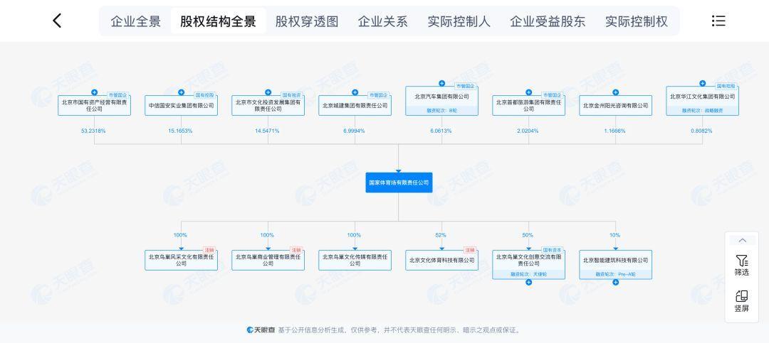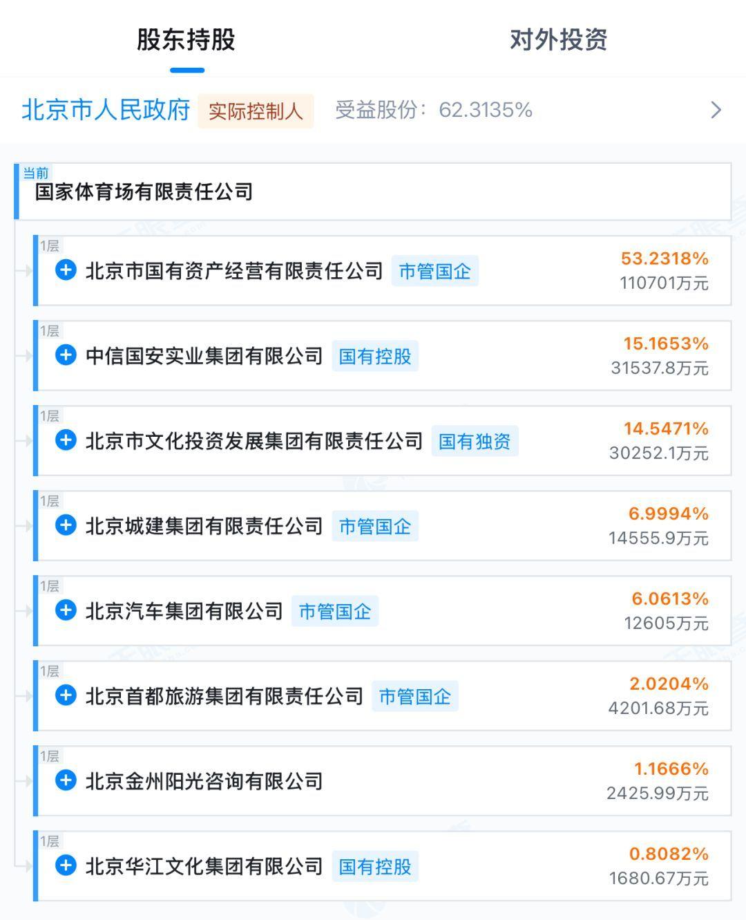 从资本视角看,此次合作实则是一次精准的战略卡位。天眼查显示,国家体育场有限责任公司注册资本近208亿元,股东阵容以国有资本为主导:北京市国有资产经营有限责任公司持股53.23%,中信国安实业集团有限公司、北京市文化投资发展集团有限责任公司分别持有15.17%和14.55%股权。在此前,民营资本从未获得过真正的入场机会。