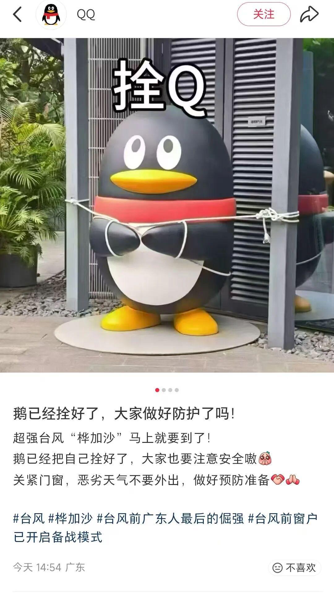 随着超强台风‘桦加沙’逼近,广东进入临战状态,全省各地积极部署防御措施。迎战台风过程中,广东人民各出奇招:户外装置‘戴珍珠耳环的猫’被五花大绑,有市民将汽车绑紧固定,甚至企鹅雕塑也被网友戏称为‘拴Q’。