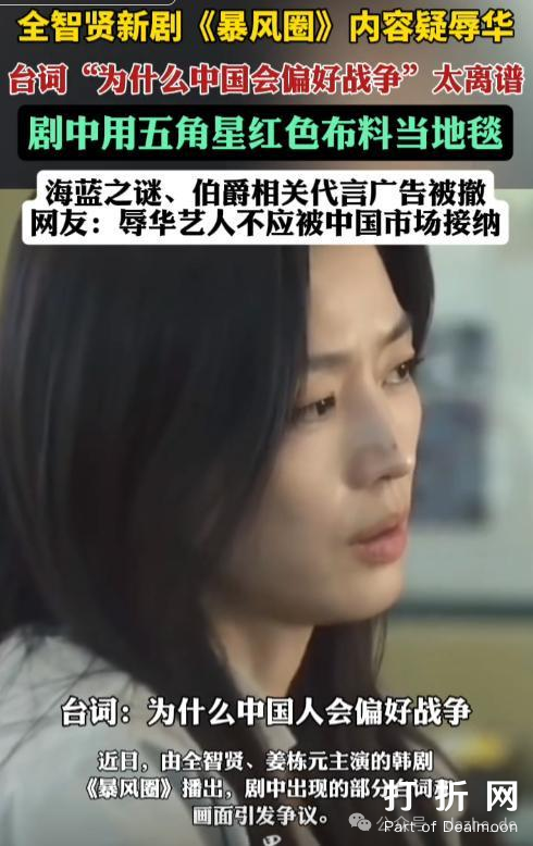 据中国《大河报》、香港01等媒体报道,全智贤与姜栋元主演的《暴风圈》近期刚开播便引发了巨大争议。全智贤在剧中饰演一名前外交官,然而在第四集中,那句“为什么中国会偏好战争?”的台词,直接让网友们炸开了锅。