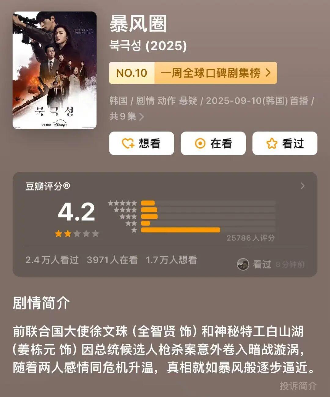 这场风波如野火般蔓延,海蓝之谜、LV、伯爵等奢侈品牌紧急撤下全智贤的所有广告内容。《暴风圈》在豆瓣的评分也从开播时的7.1分暴跌至4.2分,评论区充斥着中国观众的愤怒与失望。
