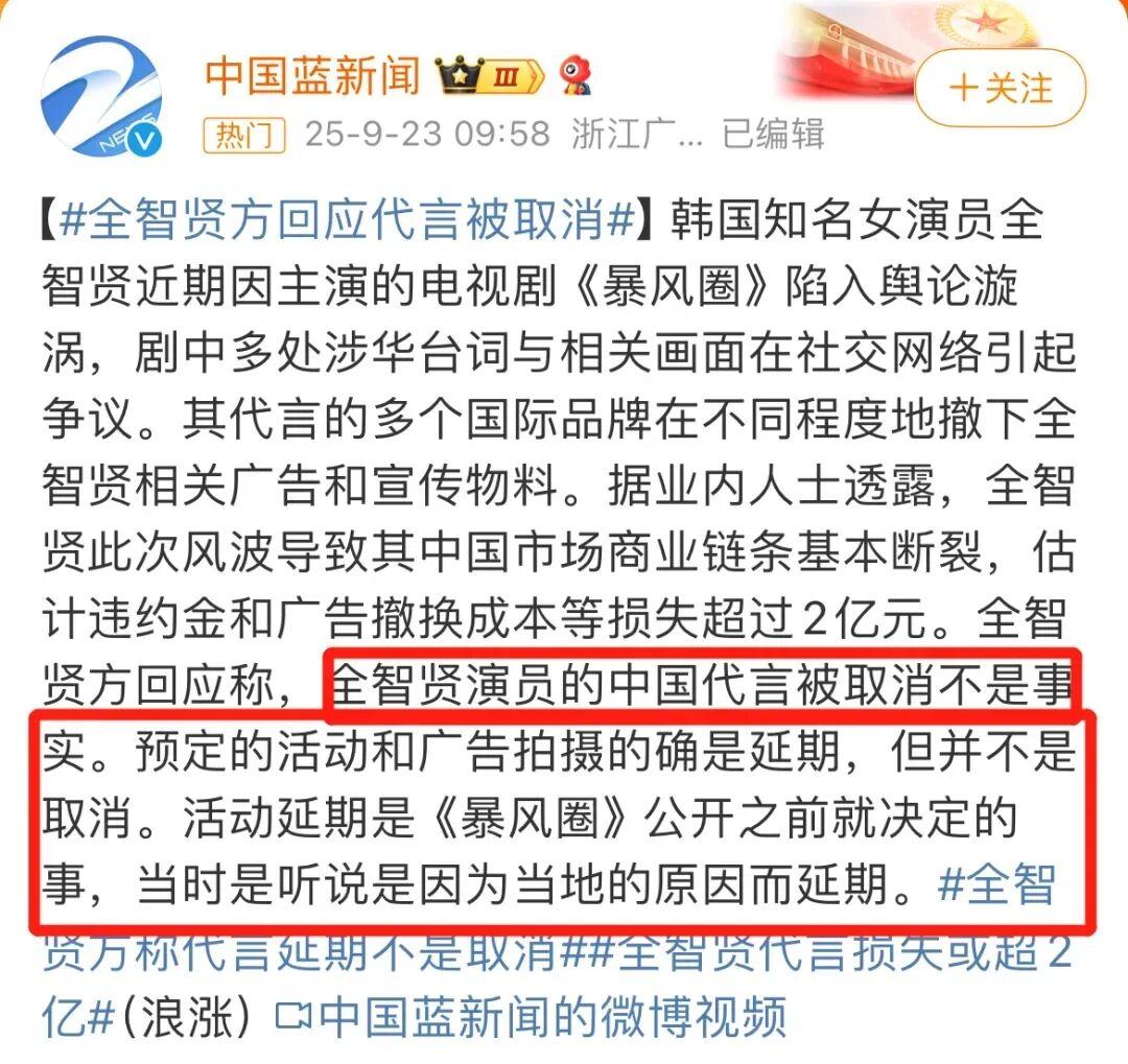 值得一提的是,全智贤还在昨天进行了辟谣,称“代言只是延期,剧集播出前就安排好了”,似乎试图挽尊,但品牌的“割席”动作已经足以说明问题。