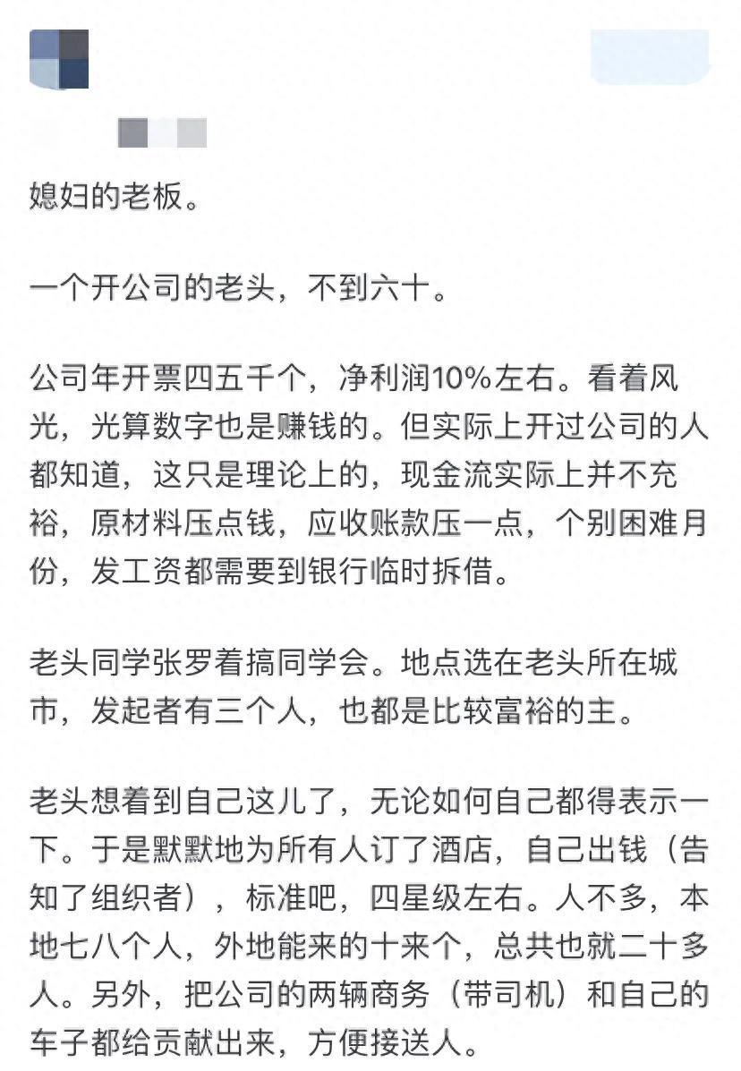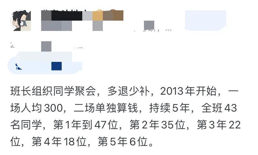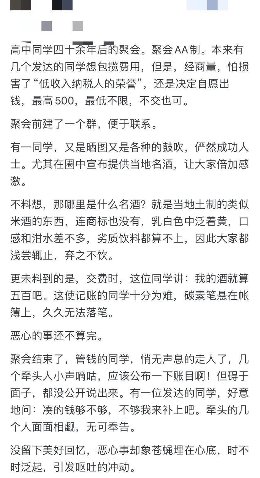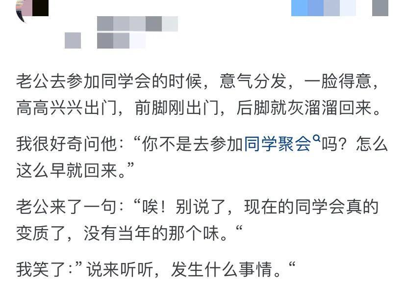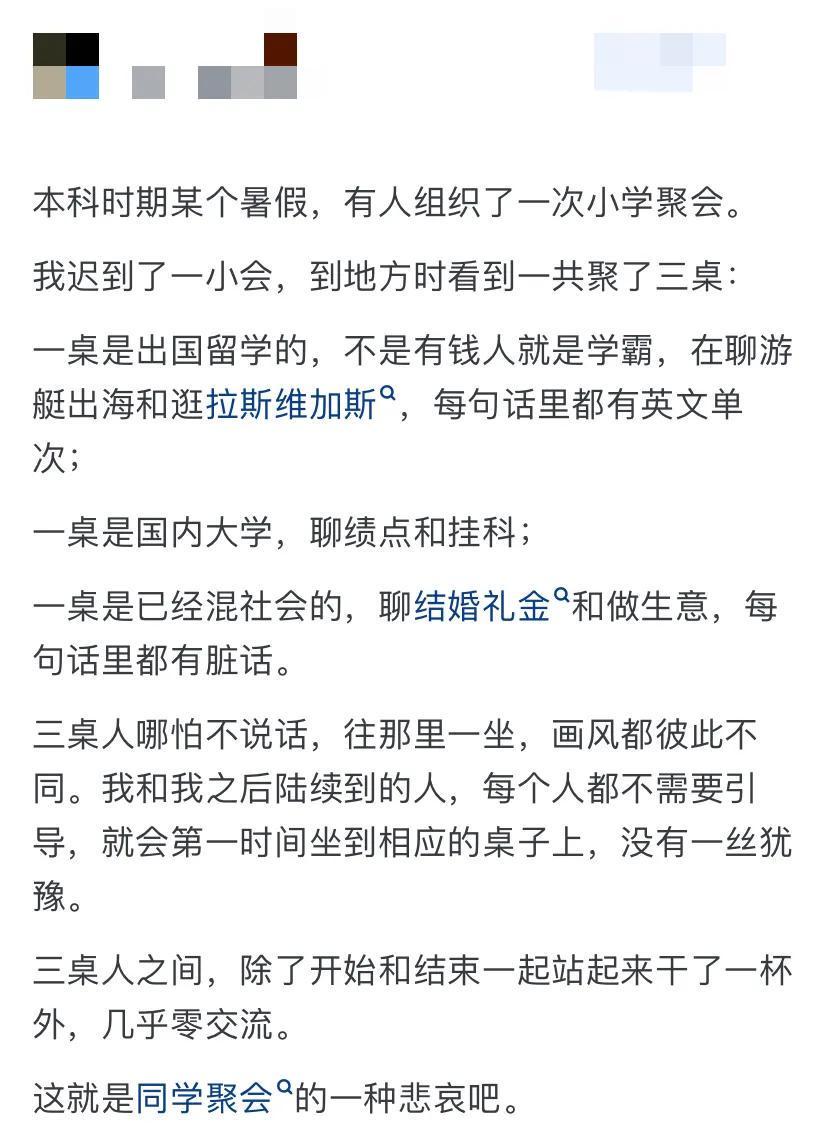 有网友直言不讳:混得特别好的,比如老总、厅级干部等,他们根本不会去参加这种同学聚会。人家更倾向于私底下的小聚。而混得特别差的,比如拿低保的,也不会参加。只有那些高不成低不就,或者稍微有点小钱想展示却没地方展示的人,才会热衷于参加同学聚会。