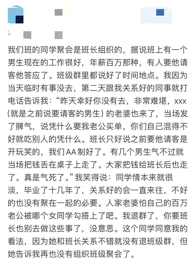也有网友表示不喜欢同学聚会,觉得在那咋咋呼呼一通吆喝,却一点实质性东西都没有。还不如工作以后认识的朋友,大家可以互相讨论投资、理财、孩子上学、介绍工作等实际问题。心情不好了还能互相安慰。而这些在同学之间却很难实现。同学之间的攀比之心、嫉妒之心太重,还经常能感觉出一帮人攀高踩低、自以为是,这让人很厌恶。
