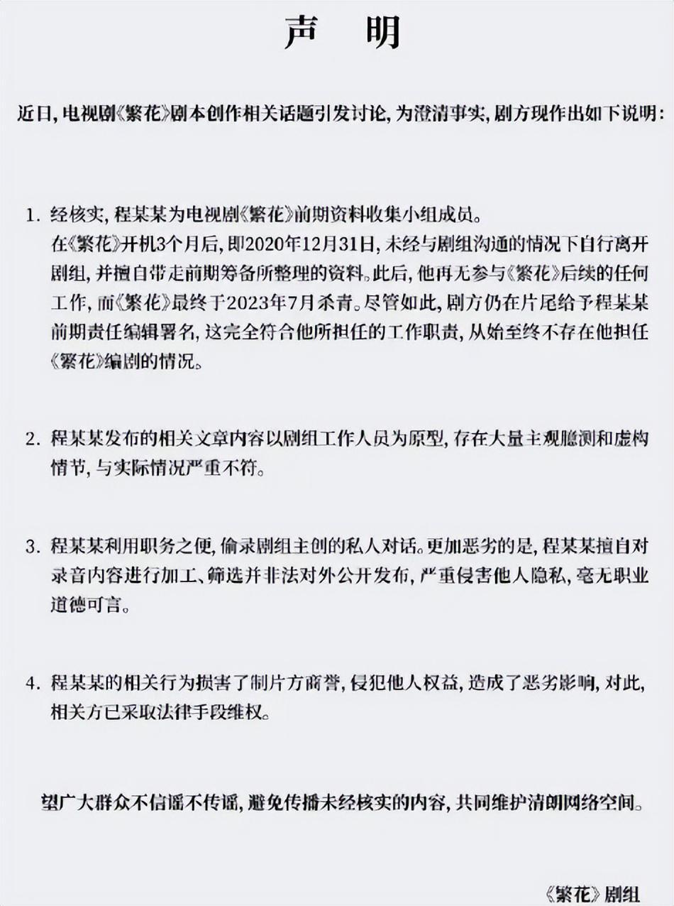 在剧组发布的声明中也提到了录音的问题,说是对方偷录剧组主创私人对话,而且还对内容进行了加工,相关方已经进行了维权。