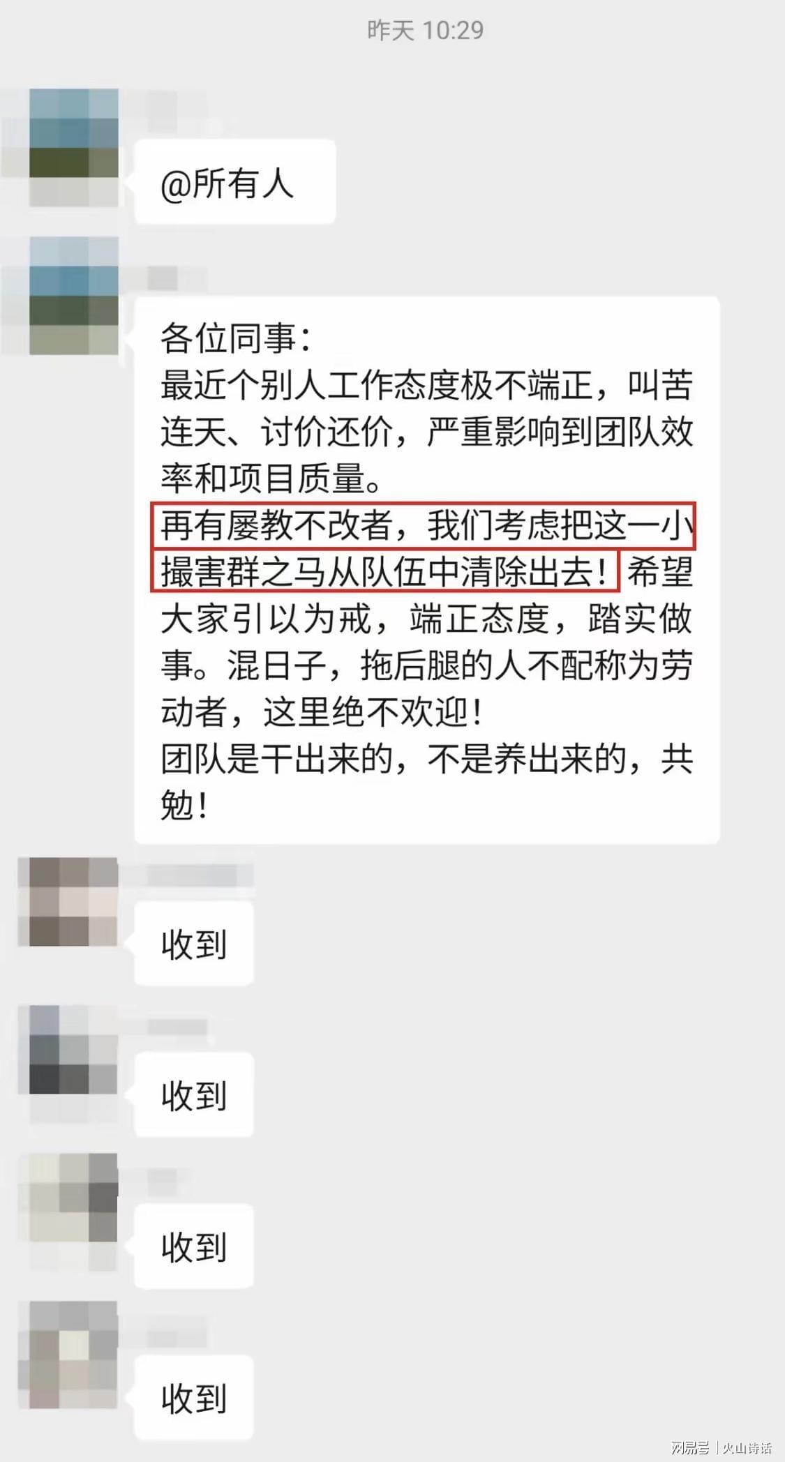 据悉,该设计院领导在群内表示,近期有部分员工在工作态度上出现了严重问题,对于安排的工作任务不仅叫苦连天,还讨价还价,这种行为严重影响了团队的协作效率和项目的整体质量。领导认为,这样的人不配留在团队中,必须予以清除。