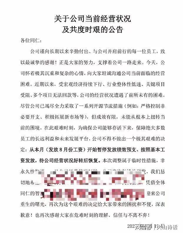 无独有偶,9月10日,网传四川某设计院也发布了类似公告,称因公司遭遇重大经营困难,特别是多个项目无法回款,导致资金周转压力巨大。为了缓解燃眉之急,公司决定采取全员降薪的方式,并强调这是短期行为,待公司经营状况好转后将恢复原有薪资水平。