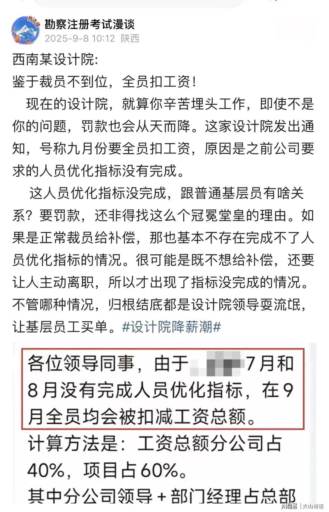 而近日,又有网友爆料称,西南某设计院也采取了类似措施。据称,该设计院因裁员不到位,决定对全员进行扣工资处理。网友表示,现在的设计院即便员工辛苦工作,也可能因非个人原因而遭受罚款。这家设计院发出的通知称,九月份要全员扣工资,原因是之前公司要求的人员优化指标没有完成。