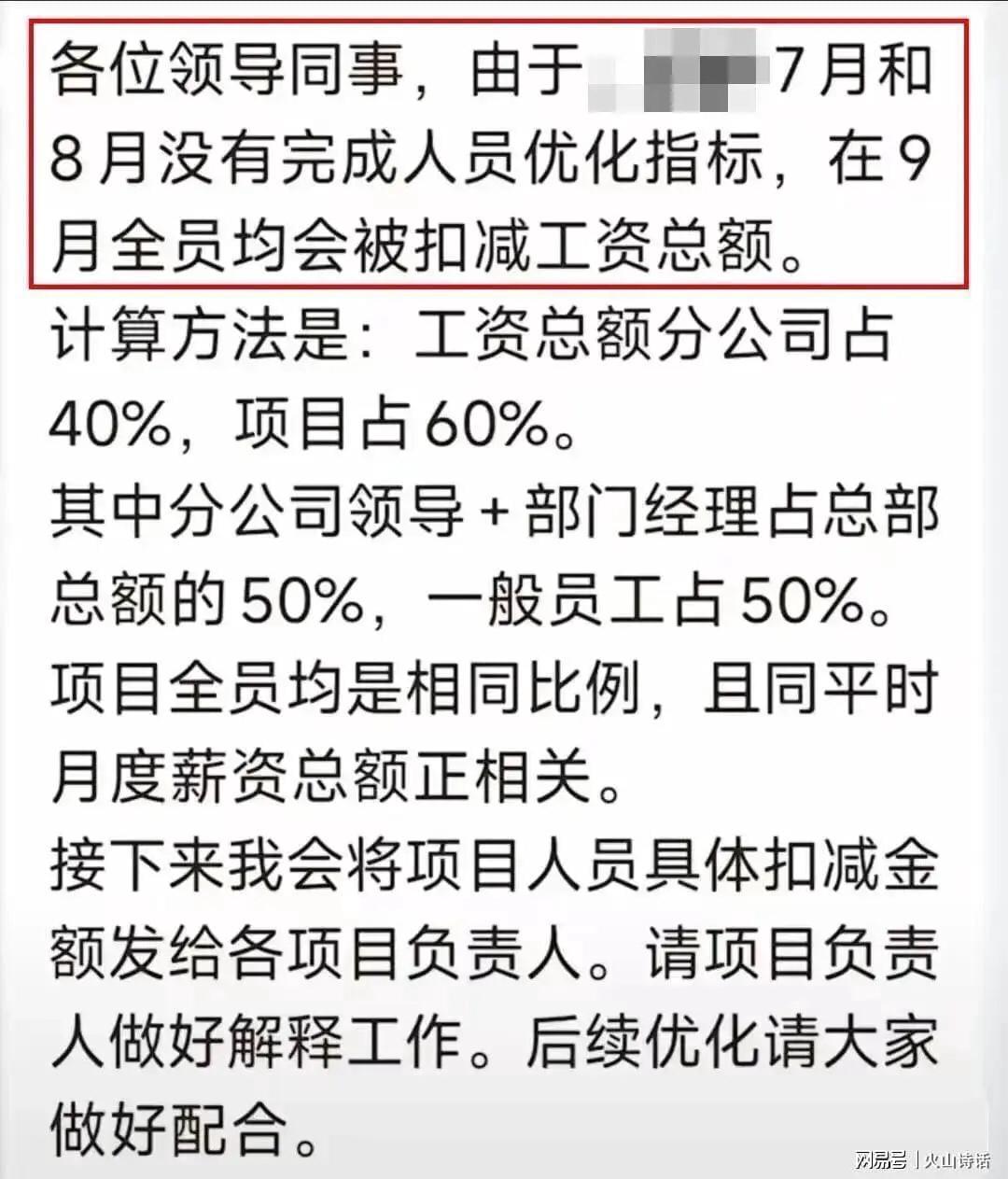 根据该网友提供的信息显示,这是一个通知截图,其中明确提到了人员优化考核目标达成的“连坐”机制。领导和部门经理占总部扣钱总额的50%,普通员工平摊剩下的50%;项目上不管职位高低,全员按相同比例扣,工资越高,扣得越多。