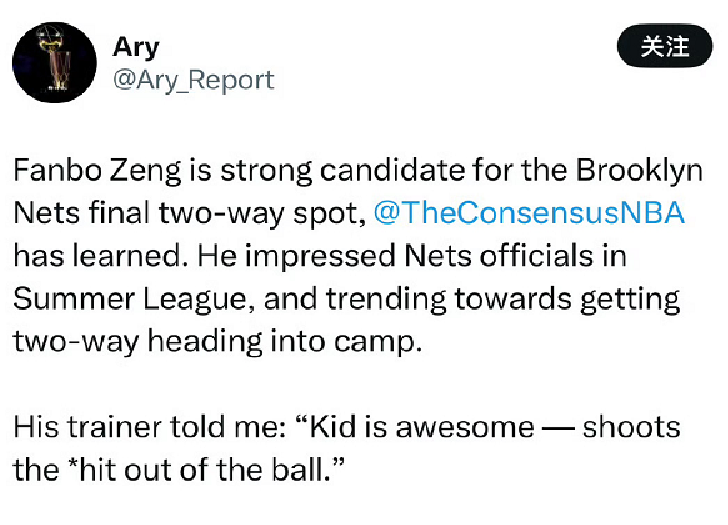 据此前多家美国媒体的报道,曾凡博是篮网队最后一个双向合同的有力竞争人选,这足以证明他在球队中的潜力和价值。
