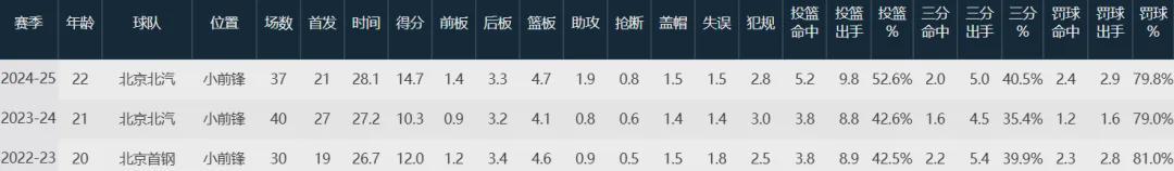 身高2米08的曾凡博,是一位三至四号位的摇摆人。他投篮精准,运动天赋出色,防守端可以覆盖1-5号位,并且盖帽意识灵敏。上赛季在CBA常规赛中,他场均贡献14.7分4.7板1.9助1.5帽,三分命中率高达40.5%;季后赛中,他更是场均砍下15分4.2板1助1断1.6帽,三分命中率提升至43.3%,展现出了不俗的实力。