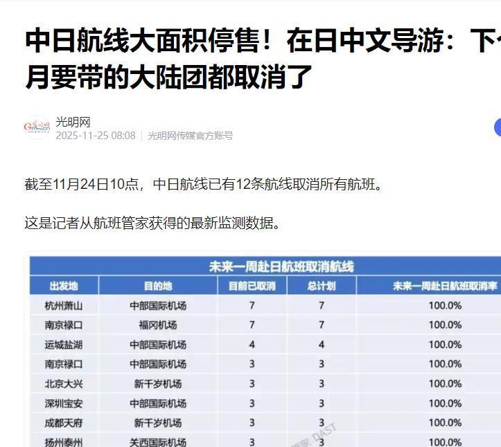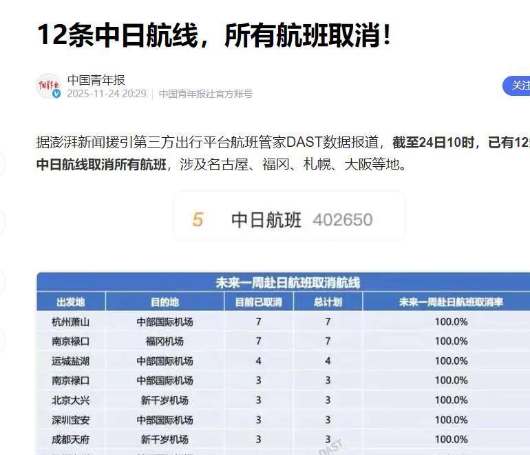 2025年11月24日这天,中日航空圈炸了——12条主力中日航线集中停飞,涉及名古屋、福冈、札幌、大阪等热门城市,所有已出票航班全部取消。