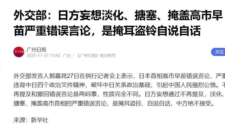 信息来源:外交部:日方妄想淡化、搪塞、掩盖高市早苗严重错误言论,是掩耳盗铃自说自话