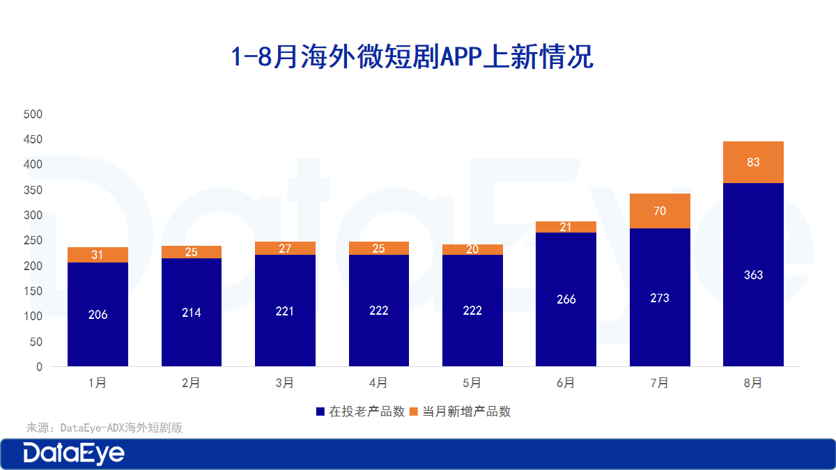 国内微短剧市场竞争已进入白热化阶段,头部厂商纷纷将目光投向海外。根据DataEye-ADX海外短剧数据,当前在投的海外微短剧APP数量达446款,8月新增APP数量环比增长18.57%,市场热度持续攀升。