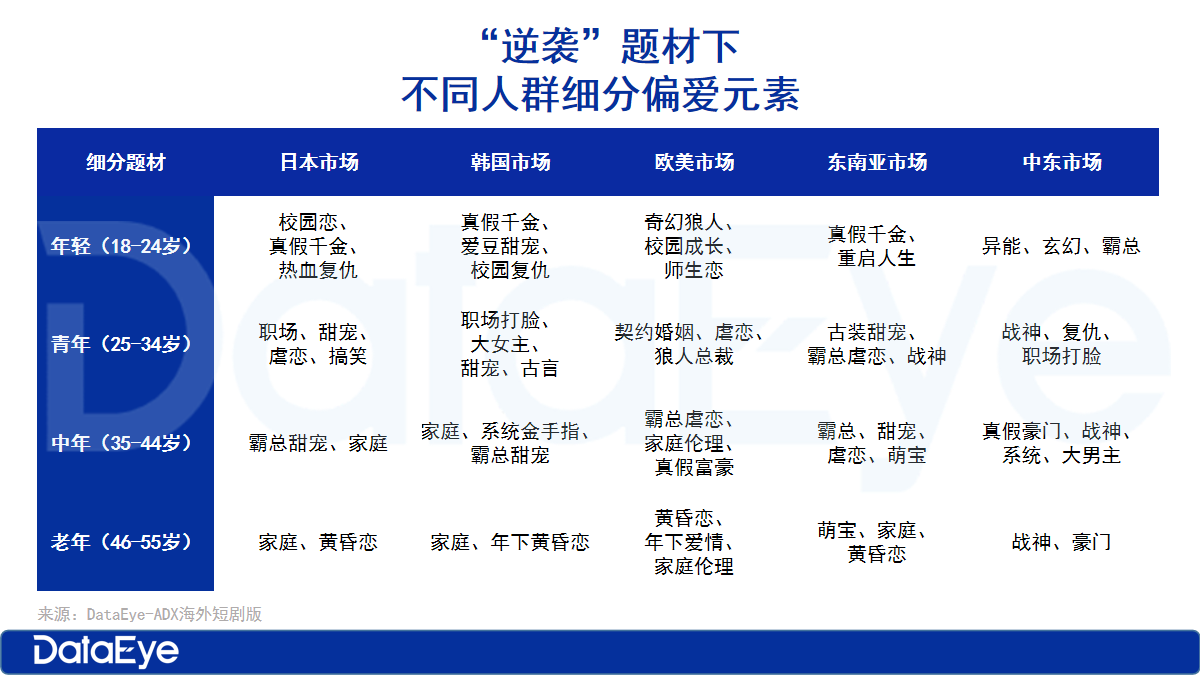 以逆袭题材为例,DataEye分析8月海外市场在投的6524部逆袭题材微短剧发现,日本观众更关注“逆袭+赘婿/家庭/复仇”元素,韩国观众倾向“逆袭+都市/甜宠/职场”组合,欧美观众偏好“逆袭+CEO/狼人/虐恋”类型,中东观众则更偏爱“逆袭+大男主/超能/战神”题材。